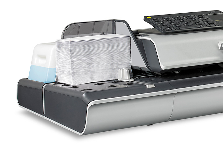 The iX-9 sets a new standard for mailing system productivity, operability, and efficiency. Designed with the operator in mind, this mailing system delivers simple ergonomic operations, investment protection, cost savings, reliable production and maximum uptime. Ideal for high mail volume, the iX-9 automatically seals, weighs, measures, meters, and stacks large mail runs in minutes. With batch processing speeds of up to 300 letters per minute, the iX-9 is the workhorse of mailing systems. The iX-9 also meets the latest Intelligent Mail® Indicia (IMI) and Dimensional Weighing (DIM) USPS® requirements.